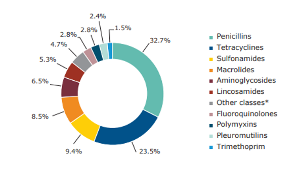 ➤ En 2022, las clases de antibióticos más vendidas en 31 países europeos fueron las penicilinas (32,7%), las tetraciclinas (23,5%) y las sulfonamidas (9,4%), que representan el 65,5% de las ventas totales de medicamentos veterinarios antibióticos para animales destinados a la producción de alimentos, en mg/PCU.